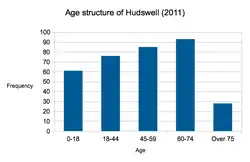According to the 2011 census, the population of Hudswell is 353; divided between 169 males and 184 females.[10] 17.3% of the population was aged 0 to 17; 24.3% aged 18 to 44; 24.1% aged 45 to 59; The largest age group was between 60 and 74 with 26.3% and 7.9% aged 75 and over.[11]