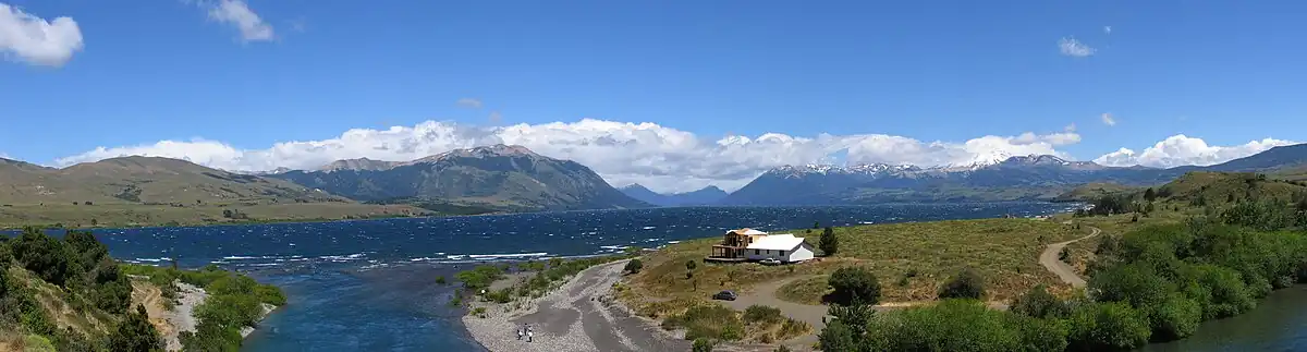 Lake Epulafquén, 7 kilometres (4.3 mi) long, is the southern arm of the lake. A complex of volcanoes, the Huanquihue Group, 2,139 metres (7,018 ft) in elevation, rise above its southern shore.[3] About 1800 CE, a lava flow from one of the volcanic cones reached the southern shore of the lake causing a rocky, distorted delta.[4] A short, turbulent stream brings the waters of two additional lakes, Lake Curruhué, 12 kilometres (7.5 mi) long, and Green Lake, 1 kilometre (0.62 mi) long, into Lake Epulafquén. Another short stream feeds into Lake Epulafquén from Lake Carilafquén, 1 kilometre (0.62 mi) long. Hot springs and thermal baths are located near the shores of this lake.[5]