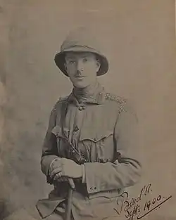 Lord Grosvenor had taken a commission with the Royal Horse Guards and was in South Africa serving in the Second Boer War when, in December 1899, he succeeded his grandfather. After a brief visit home, he returned in February 1900 to serve with the Imperial Yeomanry as an ADC to Lord Roberts and Lord Milner.[11] He resigned his commission in December 1901,[12] and was appointed captain of the Cheshire (Earl of Chester's) Imperial Yeomanry the following month.[13] After the war, he invested in land in South Africa and Rhodesia, and visited the colony with his wife in late 1902.[14] He was promoted to major in the Cheshire Yeomanry in 1906.[11]