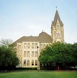 The Cullen Building is a roughly rectangular three-story hall, clad with local white limestone on its facade, with a large square tower projecting several stories higher from the southwest corner, and a smaller round tower on the southeast corner.[3] The building is designed in a Richardsonian Romanesque style, with rusticated stonework, cylindrical buttresses with conical caps, and round-headed Romanesque arches mixed with rectangular transom windows.[3] The exterior walls are made of hand-laid 18-inch (46 cm) limestone,[7] laid by builders Flume & Waterston, who had also previously done stonework for the Texas State Capitol.[2] As additional buildings have been added to Southwestern's campus, the Cullen Building's architectural style has served as the standard for their design.[4]