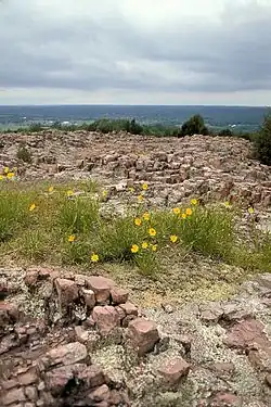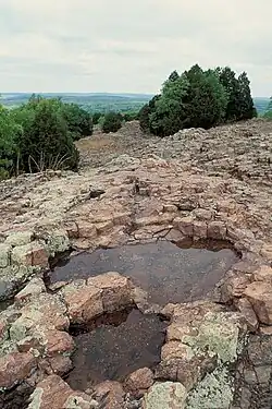 Hughes Mountain is a peak in the St. Francois Mountains Range of southeastern Missouri. These granite and rhyolite rocks of these mountains formed 1.485 billion years ago during the Proterozoic Eon when the area was volcanically active.[8] Hughes Mountain is formed of extrusive rhyolite which fractured into vertical joints when it cooled, creating polygonal columns. These columns have from four to six sides and are up to three feet (0.91 m) tall. When viewed from above they resemble a honeycomb.