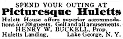 Until 1874 the Huletts Landing area was known as Bosom Bay.[4] Successive generations of the Hulett family lived by farming the area until Philander Hulett began to develop the area in the 1870s by building a steamship landing and submitting an application to build a post office.[5] The post office application is the earliest document to use the Huletts Landing name.[5] The existing Lake George Steamboat Company, which delivered mail as well as passengers, probably required either a post office or a tourism facility in order to justify adding a new stop to its schedule.[5] An influential travelogue by Rev. William Henry Harrison Murray was published in 1868 and praised the Adirondacks for the relaxing effects of its picturesque wilderness.[6] The first railroad service into the region was also built in the 1870s.[6] The application received approval and Philander Hulett built the post office shortly afterward, housed in the same building as the community's first store.[5] He served as postmaster until his death in 1883, but sold his property.[5]