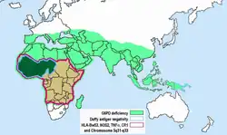 - ^ Ruwende C, Khoo SC, Snow RW, Yates SN, Kwiatkowski D, Gupta S, Warn P, Allsopp CE, Gilbert SC, Peschu N, Newbold CI, Greenwood BM, Marsh K, Hill AV (1995). "Natural selection of hemi- and heterozygotes for G6PD deficiency in Africa by resistance to severe malaria". Nature. 376 (6537): 246–249. Bibcode:1995Natur.376..246R. doi:10.1038/376246a0. PMID 7617034. S2CID 4301352.