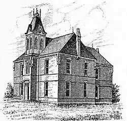 The children of Humphreys were educated in a typical one-room rural schoolhouse, located about three-fourths of a mile northwest of the community until 1885. At that time, the elementary and secondary education were combined with and housed in the building containing the Humphreys College and Business Institute. The College was established in 1884 on four acres of land donated by James M. Stringer. A large two-story brick structure was constructed between June and September 1884, with the first class admission beginning on September 29 of the aforementioned year. Humphreys College was co-education and offered two course tracks of study—preparatory and collegiate, with a reported enrollment in 1887 of 157 students. No dormitories were constructed; however, ample housing was available in the town's hotels and private homes.[9] Humphreys College and Business Institute was completely destroyed by fire on April 8, 1893.[10]