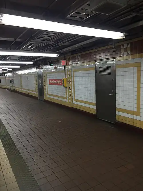 Hunting Park station is a SEPTA Metro stop in Philadelphia. Served by the B1, it is located at 4200 North Broad Street at Hunting Park Avenue in the Hunting Park section of North Philadelphia, Pennsylvania. This is a local station, and thus has four tracks, with only the outer two being served. There are separate fare control areas for the northbound and southbound platforms, and no crossover exists.