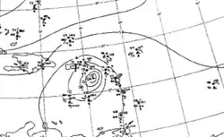A cold front moved southeastward from the East Coast of the United States on December 23, 1954, and passed over Bermuda two days later. A strong anticyclone developed behind the cold front, and on December 26 a trough extended southward from the cold front. The anticyclone moved southeastward as the trough and cold front moved eastward. The trough gradually decelerated as high pressures altered the upper level flow to that of an easterly flow. Convection increased over the trough as it moved over relatively warm waters, about 1 °C (1.8 °F) above normal, and began undergoing tropical cyclogenesis after a circulation began to develop along the northern portion of the trough. The system continued to organize as it moved to the west, and based on three ship reports confirming a closed circulation, it is estimated the system developed into a tropical depression on December 30 while located 770 miles (1,240 km) east-northeast of Barbuda in the Lesser Antilles, though operationally, the system was believed to have become a tropical depression on December 31.[1]