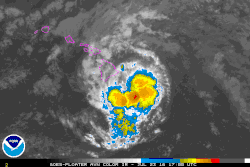 Soon after, Darby turned west-southwestwards as it continued to weaken, but the shear diminished slightly on July 21, allowing Darby to restrengthen to winds of 65 mph (105 km/h).[16] The reprieve was short-lived, however, as an approaching upper-level low once again increased shear over the system the next day.[17] Darby began to curve back to the west on July 23 as it approached a weakness in the aforementioned subtropical ridge, all the while weakening slowly.[18] Just after 00:00 UTC on July 24 (2:00 p.m. HST on July 23), Darby made landfall on the Big Island near the village of Pahala in the Kaʻū District, with winds of 40 mph (64 km/h).[19] This marked one of only six occurrences of a tropical cyclone of tropical storm intensity or higher making landfall on one of the major islands in the state of Hawaii since record keeping began in 1949. The others were an unnamed tropical storm in 1958, Hurricane Dot in 1959, Hurricane Iniki in 1992, Tropical Storm Iselle in 2014, and Tropical Storm Olivia in 2018.[20] After crossing the Big Island, Darby began to accelerate northwestwards in earnest while maintaining as a minimal tropical storm.[21] On July 25, Darby weakened into a depression,[22] and degenerated into a remnant low on the next day 265 mi (426 km) west-northwest of Honolulu.[23]