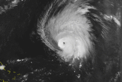 ![]() Erika to the north of the Lesser Antilles shortly after peak intensity on September 9 | |
