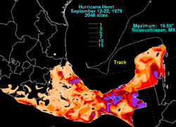 Although Henri did not affect land in any way as a hurricane, the developing system threatened several states along the southwestern coastline in Mexico.[4] Mexican forecasting officials issued an advisory for the Gulf coast towns of Tampico in Tamaulipas, and Tuxpan and Nautla in Veracruz, to evacuate to higher ground.[6] The government of Veracruz issued warnings on radio and television of possible flooding in oil-rich coastlines.[7] The storm affected cleanup operations of the Ixtoc I oil spill as it passed over the spill area, damaging a 310-ton steel cap designed to stop the blowout.[8] Henri caused driving rains, strong winds, and floods in Ciudad del Carmen, Campeche, forcing over 2000 people from their homes. Waters swelled in the town to about 12 inches (305 mm) above sea level.[9] Maximum rainfall recorded in Mexico in association with Henri was 19.59 inches (498 mm) at Solosuchiapan.[10]