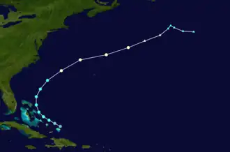 The overall size of Kate was initially relatively small, with a compact central dense overcast (CDO) extending only 40 miles (64 km) from the center of the storm. Kate continued to move to the west-northwest while steadily strengthening, and later made its closest approach to The Bahamas on November 9 – passing about 15 miles (24 km) from Cat Island.[4] However, observations reported that the circulation of Kate was very small and did not register in some of the operating stations.[1] By the early morning hours of November 10, Kate began to turn to the north in response to a trough that was coming off the East Coast of the United States.[5] Shortly thereafter, Kate strengthened to just below hurricane intensity with winds of 70 mph (110 km/h), and was initially predicted to become a hurricane shortly thereafter before passing over cooler sea surface temperatures,[6] however intensification briefly halted. By 00:00 UTC on November 11, Kate had intensified into a hurricane as it began to accelerate northeast into and become embedded into the mid-latitude westerlies, after a microwave pass revealed banding features had become more defined near the center.[7][1] This made it the latest-forming hurricane in the Atlantic basin since Hurricane Epsilon in 2005.[8] Shortly afterwards, Kate reached its peak intensity with winds of 85 mph (140 km/h) and a pressure of a 980 millibars (29 inHg) based on continued improvement of its satellite presentation.[1] Afterwards, colder waters and increasing wind shear caused Kate to weaken, and it transitioned into an extratropical cyclone by 00:00 UTC on November 12. The remnants of Kate continued to accelerate over the North Atlantic Ocean for another day before slowing down dramatically and turning eastwards before being absorbed by a larger cyclone on November 13.[1]