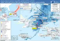 Matthew Town experienced winds from the core of Oscar.[2] On Grand Turk, where the capital of the Turks and Caicos Islands is located, Oscar knocked down some trees and removed the roofs of at least one house. In Inagua, multiple homes sustained broken windows and damaged roofs. Also, numerous trees were uprooted and power lines were damaged.[2] However, as there was a low tide, the hurricane caused minimal impacts in the islands.[37] A shelter in Inagua housed 24 people.[38] The DRM Authority sent food items to the southern islands after Oscar had left.[39]