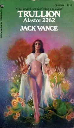 Trullion: Alastor 2262 (1973) is a science fiction novel by American writer Jack Vance, first published by Ballantine Books. It is one of three books set in the Alastor Cluster, "a whorl of thirty thousand live stars in an irregular volume twenty to thirty light-years in diameter."[1] Three thousand star systems are inhabited by five trillion humans, who are governed by the mostly hands-off Connatic. Occasionally, in the manner of Harun al-Rashid of The Thousand and One Nights, the Connatic travels in disguise among the people.