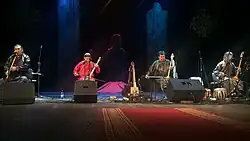 Since the group's inception, Huun Huur Tu has collaborated with musicians from many genres, such as Frank Zappa, Johnny "Guitar" Watson, the Kodo drummers, The Moscow Art Trio, the Kronos Quartet, The Chieftains and Bulgarian women's singing group, Angelite.[5][6][7][8] Their recording "Eternal" is a collaborative effort with underground electronic musician, Carmen Rizzo.[9] Huun Huur Tu appeared on three songs on Bahamut, the debut of New York-based blues group Hazmat Modine. In January 2010, Hazmat Modine also announced plans to record with Huun Huur Tu again.[10]