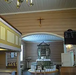 The earliest existing historical records of the church date back to the year 1398, but the church was not built that year. The first church at Hvarnes was a wooden stave church that was likely built around the year 1200. In 1398, the stave church was dedicated to St. Olav. By the late 1600s, the church was said to be showing signs of rot and decay. In 1671, the church building was purchased by the Countship of Larvik, but the building was not improved. Around 1700, it was decided to tear down the old church and rebuild it on the same site. The new church was completed in 1705. The new long church was built of log construction and it has a rectangular nave and a rectangular chancel. In 1708, the church received exterior paneled siding. It also got more beams and iron bolts to improve its structural integrity. It is uncertain if the wooden tower was part of the original construction, but by 1713, there was a wooden tower at the main entrance on the west end of the nave. In 1849, a small sacristy on the south side of the chancel was built (and it was enlarged in 1896). The church was painted maroon on the outside until 1872, but was then painted white. At the same time, the interior was repainted. Then there were further interior changes in 1928–29 before a major restoration in 1977 which saw the interior colors changed back to the original. Inside, the church has a second floor seating gallery along the west wall and north wall of the nave. The chancel opening is round-arched, and the chancel and nave both have a flat ceiling, with the chancel ceiling being significantly lower than that of the nave.[3][4]
