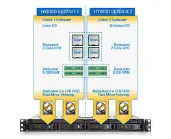 The server is separated into hybrid server environments using Red Hat KVM or any other virtualization. Each hybrid environment is securely isolated and has guaranteed resources available to it which ensures a high level of performance and responsiveness. A hybrid server combines all of the benefits of virtualization technology with the performance of a full dedicated server. So, an administrator can use automation to suspend, restart, or reinstall the operating system. One large server is split into a few (normally two) Hybrid servers. The benefits of this platform also include access through a single point of contact; sharing the network infrastructure; and monitoring, delivering, and managing hosting services.[2]
