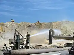 Hydraulic mining is a form of mining that uses high-pressure jets of water to dislodge rock material or move sediment.[1] In the placer mining of gold or tin, the resulting water-sediment slurry is directed through Sluice boxes to remove the gold or tin. It is also used in mining kaolin and coal.