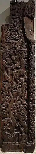 The carvings show several scenes from the legend of Sigurð Fáfnir's bane. A section of one of these carvings in which Sigurð kills Regin was the basis for a Norwegian postal stamp.[1]