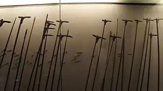 One weapon specifically-mentioned in "Hymn to the Fallen" is the variously-translated ge (Chinese: 戈; pinyin: gē; Wade–Giles: ko. (Note that the two Chinese words and characters for ge -- weapon and song -- are distinct.) Translations include dagger-axe, pike, halberd, and others (dagger-axe is descriptive, the others tend to be the names of European relatives. This long, polearm weapon generally consists of a metal blade or blades and sometimes a metal point hafted at the end of a long pole, generally of wood. Eventually these ge were mass-produced, the spear tip on the end became more common and the ji became commonly used (Chinese: 戟). The ge was known in China from earliest history through the time period when "Hymn to the Fallen" was written. Ge made in Wu (吳戈) or produced from steel made there were especially renowned, and specifically mentioned in "Hymn to the Fallen".