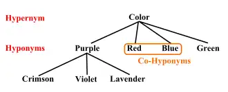 Hypernymy and hyponymy are converse relations. If X is a kind of Y, then X is a hyponym of Y and Y is a hypernym of X. [7] Hyponymy is a transitive relation: if X is a hyponym of Y, and Y is a hyponym of Z, then X is a hyponym of Z.[8] For example, violet is a hyponym of purple and purple is a hyponym of color; therefore violet is a hyponym of color. A word can be both a hypernym and a hyponym: for example purple is a hyponym of color but itself is a hypernym of the broad spectrum of shades of purple between the range of crimson and violet.