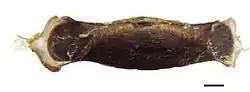 The larval case is dark brown, smooth, 9 millimetres (0.35 in) in length and 2 millimetres (0.079 in) wide. Adults were reared from case-making larvae collected on bark of a damp dead tree covered partially with lichen.