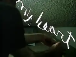 A screenshot from I... Dreaming, showing the words "my heart" scratched directly onto the film emulsion