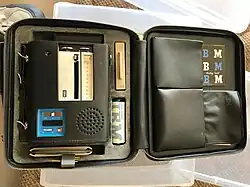 They record dictation on a magnetic belt called a Magnabelt (a mylar belt coated with a ferromagnetic material), that can hold up to 14 minutes of recordings.[5][6] A bar magnet can be used to perform a complete erasure of the belt in six seconds.[7][1] IBM advertising at the time simply said: "It could very well change your ideas about dictation equipment".[8] IBM initially claimed the belt could be re-used 1000s of times and could be easily mailed, although later advertising only claimed re-use of 100s of times.[9] IBM will later offer a belt that can hold 28 minutes.[10]