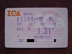 ICa (アイカ, Aika) is a rechargeable contactless smart card ticketing system for public transport in Kanazawa, Japan, introduced by Hokuriku Railroad (Hokutetsu), from December 1, 2004. The name is the portmanteau of IC and card, as well as ai (love), hoping the card will be loved by users. Just like JR East's Suica or JR West's ICOCA, the card uses RFID technology developed by Sony corporation known as FeliCa. There is a mascot fairy character called ICa-chan (アイカちゃん, Aika-chan).