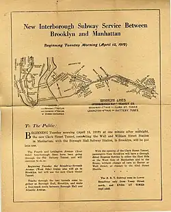 - ^ a b c "Open Clark Street Line — New Route Doubles Subway Service Between the Two Boroughs" (PDF). The New York Times. April 16, 1919. p. 18. ISSN 0362-4331. Retrieved November 6, 2016.