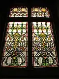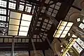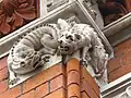 Joseph Goddard designed the Victorian Gothic structure in 1872 for the Leicestershire Banking Company. The company was a financer of major industries in Leicester and solicited proposals from local architects for a new expansion. Joseph Goddard belonged to a prominent family of architects and played a major role in introducing Victorian gothic architecture to Leicester with his clock tower design. Completed in 1874 at the cost of £7,439, the bank contrasted the classical designs of the other buildings with its corner porch, French pavilion roofs, and two-story-tall stained-glass façade.[9] Similarly spectacular, the bank's interior featured enormous hammer beams that formed a lantern roof giving the building a lofty and imposing atmosphere. The hand-carved pillars incorporated friezes and coat of arms representing cities where the company did business.[9] The project's success earned Goddard multiple commissions for new banks throughout the East Midland region. The newer banks highlight his shift towards a more restrained domestic revival and Queen Ann style. Many of his buildings are still in use and listed as historic structures by English Heritage.