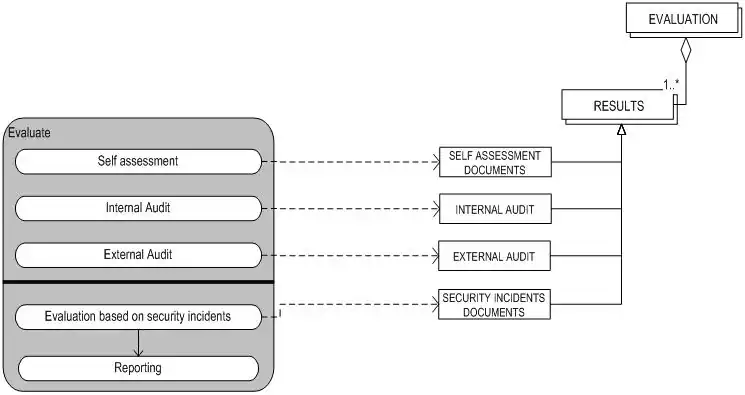 Evaluation is necessary to measure the success of the implementation and security plans. The evaluation is important for clients (and possibly third parties). The results of the Evaluation sub-process are used to maintain the agreed measures and the implementation. Evaluation results can lead to new requirements and a corresponding Request for Change. The request for change is then defined and sent to Change Management.