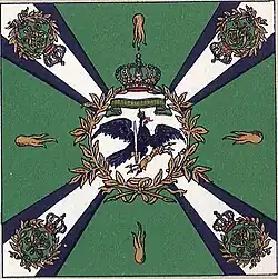Due to the large number of Line Infantry regiments then in existence, on 18 December 1890, Kaiser Wilhelm II ordered that the flag colours were to be the same as that of the uniform epaulettes. This was to ensure that each corps attained uniformity. IX and X Corps wore white epaulettes. Notwithstanding this, the flags of the Jäger Battalions would be green.[4]