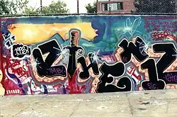 Martin was from the New York City borough of Queens, a Rockaway Beach native. Beginning in 1972, he became a long reigning all-city king of New York, known primarily for his quick, simple two letter tag, 'IZ'.[3] IZ represented a new breed of fame-obsessed writers concerned with finding the perfect balance between quantity and quality. He also wrote "CI" (for Crazy IZ), and "Ike", (short for Mike).[4] He was a member of various crews, the most notable being TMB (The Master Blasters),[4] RTW (Rolling Thunder Writers),[5] and TPA (The Public Animals).[6] He wrote graffiti on every train line in New York City. IZ THE WIZ first started writing with Evil 13 and FI 1 (aka VINNY). After going through a variety of names, including BENZ, CLICK2, and SCAT, he wrote his name Mike then dropped the first letter and chose IKE327. He began to write IZ first with VINNY. In 1976 when the movie The Wiz came out, advertising posters on the subway stations stated 'the Wiz is a Wow'. So IZ thought if the wiz is a wow why can't IZ be THE WIZ. So was born the name IZ THE WIZ.