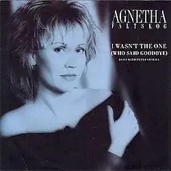 "I Wasn't the One (Who Said Goodbye)" is a duet by Swedish singer Agnetha Fältskog and American singer Peter Cetera, formerly the lead singer and bass guitar player for rock band Chicago. The track was recorded for Fältskog's third English language studio album I Stand Alone (1987). It was written by Mark Mueller and Aaron Zigman, with Cetera providing production. It was released on 22 February 1988 as the second single from the album. A Spanish language version of the song, "Yo No Fui (Quien Dijo Adiós)", was also recorded and included in South American versions of I Stand Alone.