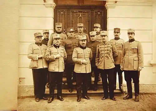 These reports were substantiated by Flondor in multiple telegrams he addressed to Marghiloman, pleading for a military intervention throughout the Duchy.[33] Literary historian Ion Filipciuc believes that, while the brigands in such descriptions have generally been taken for Austrian Sich Riflemen under Archduke Wilhelm of Austria, they were in fact "Ukrainian deserters and Bolsheviks", who numbered in the hundreds, and who only had immediate goals such as robbery.[34] Officially, Zadik's mandate was to help the Romanian National Guard and the Austrian Gendarmes—the Romanian Prime Minister, Alexandru Marghiloman, would not give open recognition to Flondor's National Council, as this would have been a breach of Romania's peace treaty with Austria.[35] However, in a letter he sent to Alexandru Tzigara-Samurcaș, Marghiloman argued that he was acting specifically against Austrian rule, and confessed that Zadik was to march on Cernăuți, the Bukovinian capital.[31] Zadik's opening proclamation to the people of Bukovina, issued on November 6, referred to his crossing over a "border placed between us by cruel fate", and to the Romanian Army as determined to ensure self-determination ("the legitimate right of peoples to dispose of their own fate").[36]
