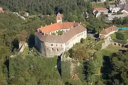 After his downfall, John was able to retain only Borostyánkő (Bernstein) and, possibly, Nempti.[6] Bernstein became his residence and the centre of his lands thereafter. He issued his charter there in March 1333, where he was styled as "Johannes dictus Farcas" (i.e. "John the Wolf") for the first time. In the document, he returned the estate of Pózva (today a borough in Zalaegerszeg) to the sons of Kalmer Geregye, which was demolished by Ivan Kőszegi decades earlier.[1] The Babonići and the Kőszegis, including John, made an alliance with the Dukes of Austria against Charles I in January 1336. When Charles signed a truce with his enemies on 13 December after a brief war, he called the members of the two families as the "traitors of the Holy Crown". The document put John's name in the second place among the traitors, following his cousin Peter the "Duke", but before the Babonići.[10]