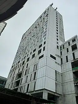 On January 20, 2020, the hotel was officially topped off,[12] and is scheduled to begin partial operations in late 2020 with full operations projected by early 2021.[13] However, due to the effects of the COVID-19 Pandemic in the country, the opening of the hotel, along with the adjacent New Gateway Mall was delayed, and the total price of the construction has inflated to ₱2 billion.[14] Another factor in the reasons that the hotel's construction was delayed was due to a case filed between the Araneta City Inc. (ACI) of the Araneta Group and Megawide Construction Corporation, regarding costing issues in various projects, such as the Gateway Mall 2. Due to these developments, the Araneta Group hired Stages, Design and Construction (SDC) as the new general contractor for the finishing works of the complex.[15][16] Design changes were also made within the hotel's original architectural design and interior facilities, such as the hotel's "wave-inspired" facade similar to the Gateway Mall 2 and the hotel's convention spaces, which was initially planned to cater 6 function rooms, and was later reduced to 5 function rooms.