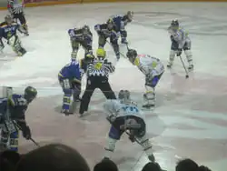 ![]() Esa Pirnes (Blues) and Michal Bros (Kärpät) in the faceoff circle during a decisive SM-liiga playoff game on 1 April 2006. | |