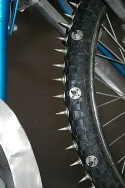 Ice racing tires are either studded or non-studded.[3] Studded tires have a stud such as a screw or bolt to provide better traction and increase speed.[4] Some studs are sharpened to increase penetration.[4] Tires cannot be purchased with studs, so the pit crews need to attach the studs to the tires.[4] Through 2008, Menard's Racing in Wisconsin manufactured and sold studded racing tires for cars, and they were required in many ice-racing classes. Cars with studded tires are generally required to contain roll cages and increased safety equipment since they achieve much more speed with the greater cornering abilities.[3]