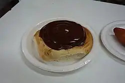 Traditional pastries include kleina, a small fried dough bun where the dough is flattened and cut into small trapezoids with a special cutting wheel (kleinujárn), a slit cut in the middle and then one end pulled through the slit to form a "knot". This is then deep-fried in oil.[6] Laufabrauð (lit. "leafbread"), a very thin wafer, with patterns cut into it with a sharp knife and ridged cutting wheels and fried crisp in oil, is a traditional Christmas food, sometimes served with hangikjöt.