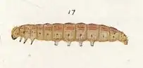The full grown larva is 1+7⁄8 inch in length, dull brownish green in colour, sometimes tinged with reddish brown, especially on posterior segments. The dorsal and subdorsal lines are very narrow but fairly well marked; dull white in colour faintly edged with red or reddish brown. The lateral line is somewhat indistinct, white in colour. On it are situated the spiracles which are dull cream-colour edged in black. The lateral line is often edged with small brown blotches situated above the spiracles, and on the anterior segments these blotches are sometimes joined to form a broad, faintly marked upward edging to the lateral line. The integument, especially on the dorsal surface, has a number of fine white branching veins, and on each segment is a number of minute black dots from which spring short brown bristles. The prolegs are of the same colour as the body, edged with dark-brown hooks. The head is horny, amber in colour, mottled and netted with brown.[5]