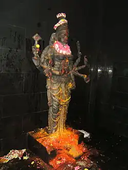 Durga (Sanskrit: दुर्गा); (listen: ⓘ); meaning "the inaccessible"[63] or "the invincible"; "one who can redeem in situations of utmost distress"[64] is a form of Devi, the supremely radiant goddess, depicted as having eighteen arms, riding a lion or a tiger, carrying weapons and a lotus flower, maintaining a meditative smile, and practicing mudras, or symbolic hand gestures. The name is made of Sanskrit dur- = "with difficulty" (compare Greek δυσ- (dys-)) and gā ("come", "go"). The buffalo sacrifice depiction transposes into ritual Durga's feat killing the buffalo demon.[65] The deity is north facing usually depicted in the wall of first precinct around the sanctum. In Tamil Nadu Shiva temples, she stands gracefully on the severed head of buffalo and lion is rarely included.[66]
