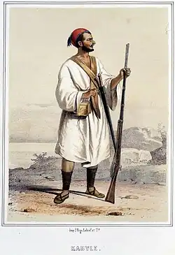 During the time of the Regency of Algiers, the Kabyles were considered such excellent infantrymen that the name "Zwawi" became synonymous with "infantryman".[11] The various factions of the Titteri tribes provided a certain number of infantrymen who at times guarded Algiers and especially the surrounding bordjs (plural of fortress). They were only paid during active service. It was also said about them: "The Zwawa are in front for misery, behind for pay."[11]