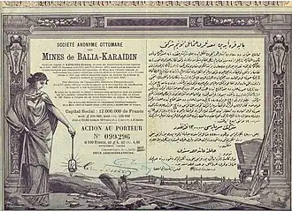![]() An ore wagon and rail track were depicted prominently on share certificates for the Société Anonyme Ottomane des Mines de Balia-Karaïdin printed in 1913 and issued in 1920. | |||||||||||||||||||||||||||||||||||||||||||||||||||||||||||||||||||||||||||||||||||||||||||||||||||||||||