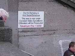 Increasing offenders’ risk of arrest is also a way to combat illegal dumping. The most common way to accomplish this is through surveillance measures, such as video cameras. Camera footage can help law enforcement officials identify dumpers while also collecting data on peak dumping periods. Installation of fake cameras has also been shown to be a deterrent. Police patrols, helicopter and plane surveillance, and community surveillance are also options for increasing risk. A police presence generally deters illegal activity, while US community surveillance depends upon residents reporting known illegal dumpers to law enforcement for a reward.[14] The cities of Los Angeles, Sacramento, and Oakland all implement similar reporting schemes.[15][16][17]