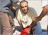 On 12 July 2002, Imad Abu Zahra was shot in the leg by members of the Israel Defense Forces, which created a gaping 5 centimeter wound in his femoral artery of the right thigh.[8] The other journalists who were with him say he was clearly marked as a journalist by the bright jacket labelled in large English letters "Journalist" and he was unarmed.[9][10] Abu Zahra laid in the street for approximately 30 minutes because the gunfire continued. After the intense, long-lasting shooting, Abu Zahra was finally shoved into an ambulance by his fellow journalist, Said Dahla. Soon after that, Abu Zahra, 35 years old, died from loss of blood.[1] The killing of Zahra was coincidentally on the same week the murderer of Wall Street Journal reporter Daniel Pearl was sentenced to death.[11] An investigation was never conducted for Abu Zahra's death but there is still concern. The concern lies in the blatant and unwarranted nature of the shooting.