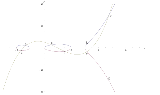 From this picture it is immediately clear that we cannot use the chords and tangents method to define a group law on the set of points of a hyperelliptic curve. The group law on elliptic curves is based on the fact that a straight line through two points lying on an elliptic curve has a unique third intersection point with the curve. Note that this is always true since lies on the curve. From the graph of it is clear that this does not need to hold for an arbitrary hyperelliptic curve. Actually, Bézout's theorem states that a straight line and a hyperelliptic curve of genus 2 intersect in 5 points. So, a straight line through two point lying on does not have a unique third intersection point, it has three other intersection points.