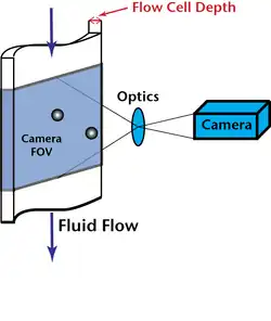 In Dynamic image acquisition, large amounts of sample are imaged by moving the sample past the microscope optics and using high speed flash illumination to effectively "freeze" the motion of the sample. The flash is synchronized with a high shutter speed in the camera to further prevent motion blur. In a dry particle system, the particles are dispensed from a shaker table and fall by gravity past the optical system. In fluid imaging particle analysis systems, the liquid is passed across the optical axis by use of a narrow flow cell as shown at right.