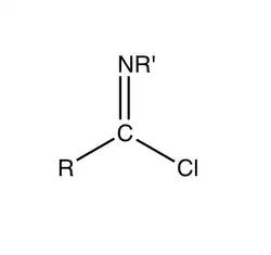Imidoyl chlorides are organic compounds that contain the functional group RC(NR')Cl. A double bond exist between the R'N and the carbon centre. These compounds are analogues of acyl chloride. Imidoyl chlorides tend to be highly reactive and are more commonly found as intermediates in a wide variety of synthetic procedures. Such procedures include Gattermann aldehyde synthesis, Houben-Hoesch ketone synthesis, and the Beckmann rearrangement. Their chemistry is related to that of enamines and their tautomers when the α hydrogen is next to the C=N bond.[1] Many chlorinated N-heterocycles are formally imidoyl chlorides, e.g. 2-chloropyridine, 2, 4, and 6-chloropyrimidines.