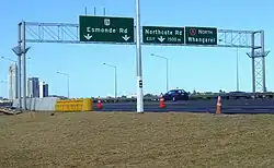 An impact attenuator, also known as a crash cushion, crash attenuator, or cowboy cushion, is a device intended to reduce the damage to structures, vehicles, and motorists resulting from a motor vehicle collision. Impact attenuators are designed to absorb the colliding vehicle's kinetic energy.[1][2] They may also be designed to redirect the vehicle away from the hazard or away from roadway machinery and workers.[3] Impact attenuators are usually placed in front of fixed structures near highways, such as gore points, crash barrier introductions, or overpass supports. Temporary versions may be used for road construction projects.