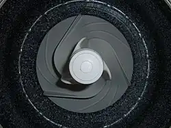 An open impeller has a hub with attached vanes and is mounted on a shaft. The vanes do not have a wall, making open impellers slightly weaker than closed or semi-closed impellers. However, as the side plate is not fixed to the inlet side of the vane, the blade stresses are significantly lower.[4] In pumps, the fluid enters the impeller's eye, where vanes add energy and direct it to the nozzle discharge. A close clearance between vanes and pump volute or back plate prevent most of fluid from flowing back. Wear on the bowl and edge of vane can be compensated by adjusting the clearance to maintain efficiency over time.[5] Because the internal parts are visible, open impellers are easier to inspect for damage and maintain than closed impellers. They can also be more easily modified to change flow properties. Open impellers operate on a narrow range of specific speed. Open impellers are usually faster and easier to maintain. For small pumps and those dealing with suspended solids, open impellers are generally used.[6] Sand locking does not occur as easily as with closed type.
